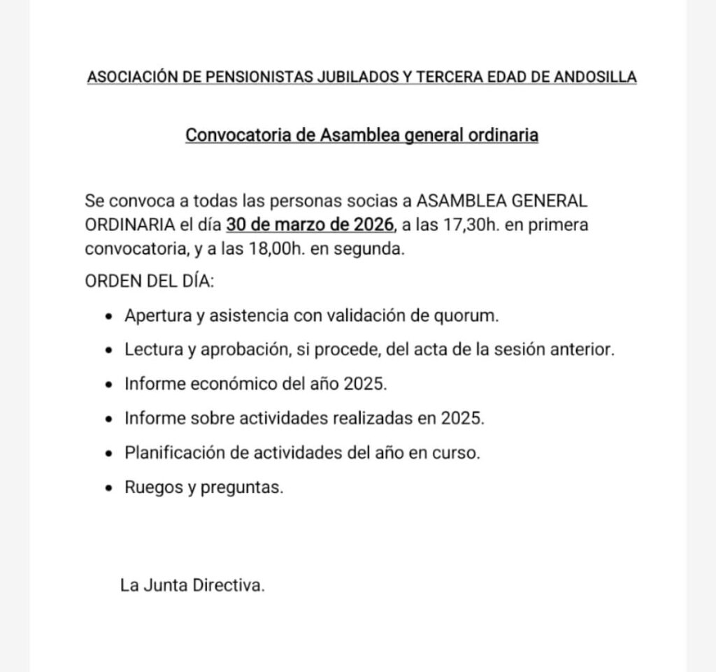 Mar302026Avisos Category: AvisosBy Carlos Resamarzo 30, 2026Post navigationPreviousPrevious post:Nuevo servicio en Andosilla: Punto de Información JuvenilNextNext post:Concentración en recuerdo a las mujeres asesinadas por la violencia machista este mesNoticias relacionadasCentro Deportivo cerradoabril 1, 2026Aviso de la Asociación de Pensionistas Jubilados y Tercera Edadmarzo 23, 2026Unidad de Documentación de DNI y Pasaportesmarzo 23, 2026Aviso de la Asociación El Motarrón Virgen de la Cercamarzo 11, 2026Encuesta de movilidad de los hogares – Tierra Estellamarzo 9, 2026Aviso de la parroquia de Andosillamarzo 9, 2026