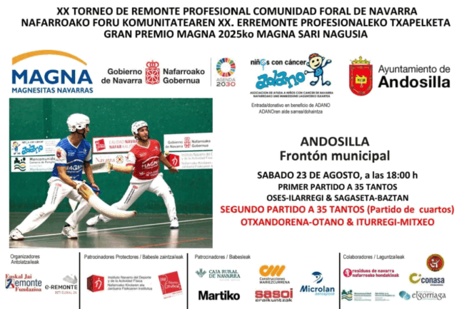El festival de remonte profesional que se disputará el próximo sábado 23 de agosto en el frontón municipal de Andosilla se organiza en beneficio de la «Asociación de Niños con Cáncer de Navarra» (ADANO). Quien lo desee puede colaborar aportando 5€ al acceder al frontón. De esta manera, participará en el sorteo de dos camisetas…