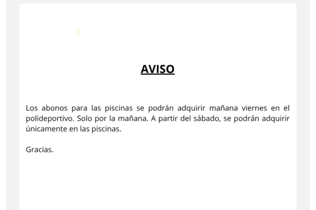 ¡Este verano, crea tu pulsera única! Taller de pulseras en las piscinas municipales. 28 de junio. Mañana: 11:00–13:00 | Tarde: 17:00–19:00 Actividad para mayores de 6 años. Inscripción: 2 € en el ayuntamiento antes del 27 de junio. ¡Anímate a participar!