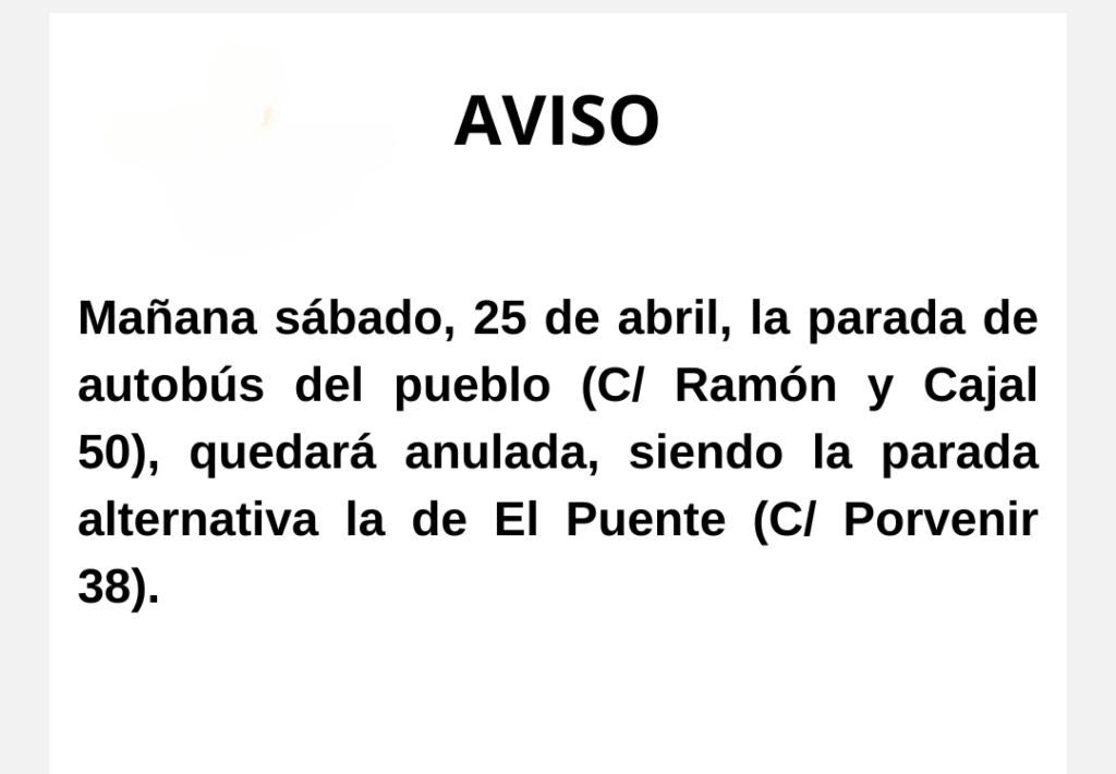 Abr242026Avisos Category: AvisosBy Carlos Resaabril 24, 2026Post navigationPreviousPrevious post:Aviso sobre la romería de Santa CruzNoticias relacionadasAviso sobre la romería de Santa Cruzabril 24, 2026Aviso de la Bibliotecaabril 17, 2026Aviso del Ayuntamientoabril 17, 2026Centro Deportivo cerradoabril 1, 2026Asociación de Pensionistas Jubilados y Tercera Edadmarzo 30, 2026Aviso de la Asociación de Pensionistas Jubilados y Tercera Edadmarzo 23, 2026