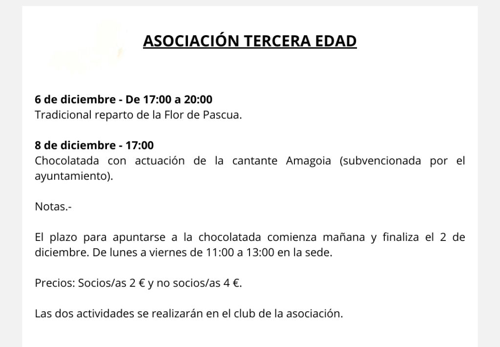 Nov242025Avisos Categoría: AvisosPor Carlos Resanoviembre 24, 2025Navegación entre publicacionesAnteriorPublicación anterior:25N: Día Internacional de la eliminación de la violencia contra las mujeresSiguientePublicación siguiente:Presentación del libro: «Centenario River Ega»Noticias relacionadasGran recogida de basura en el pueblodiciembre 28, 2025Nota informativadiciembre 22, 2025Se busca monitor/a para el Espacio Infantil-Juvenildiciembre 2, 2025Novenica del Niñodiciembre 2, 2025Vapear no es lo que parecediciembre 2, 2025Aviso Asociación Tercera Edaddiciembre 2, 2025