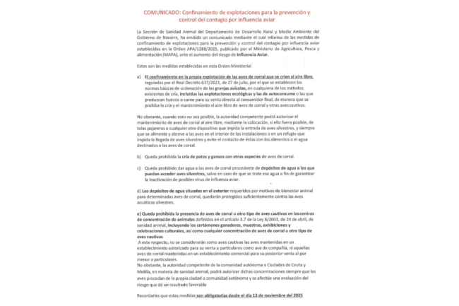 Confinamiento de explotaciones para la prevención y control del contagio por influencia aviar ComunicadosPor Carlos Resanoviembre 15, 2025