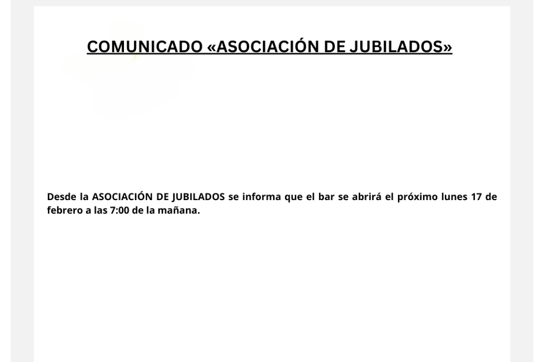 Feb132025Comunicados Categoría: ComunicadosPor Carlos Resafebrero 13, 2025Navegación entre publicacionesAnteriorPublicación anterior:Comunicado del ayuntamientoSiguientePublicación siguiente:I.T.V. móvil agrícola, ciclomotores: 25 de febrero de 2025Noticias relacionadasComunicado del Ayuntamientodiciembre 22, 2025Comunicado del Ayuntamientodiciembre 21, 2025Comunicado de la Guardia Civildiciembre 2, 2025Comunicadodiciembre 1, 2025Confinamiento de explotaciones para la prevención y control del contagio por influencia aviarnoviembre 15, 2025Comunicado del polideportivo municipaloctubre 27, 2025