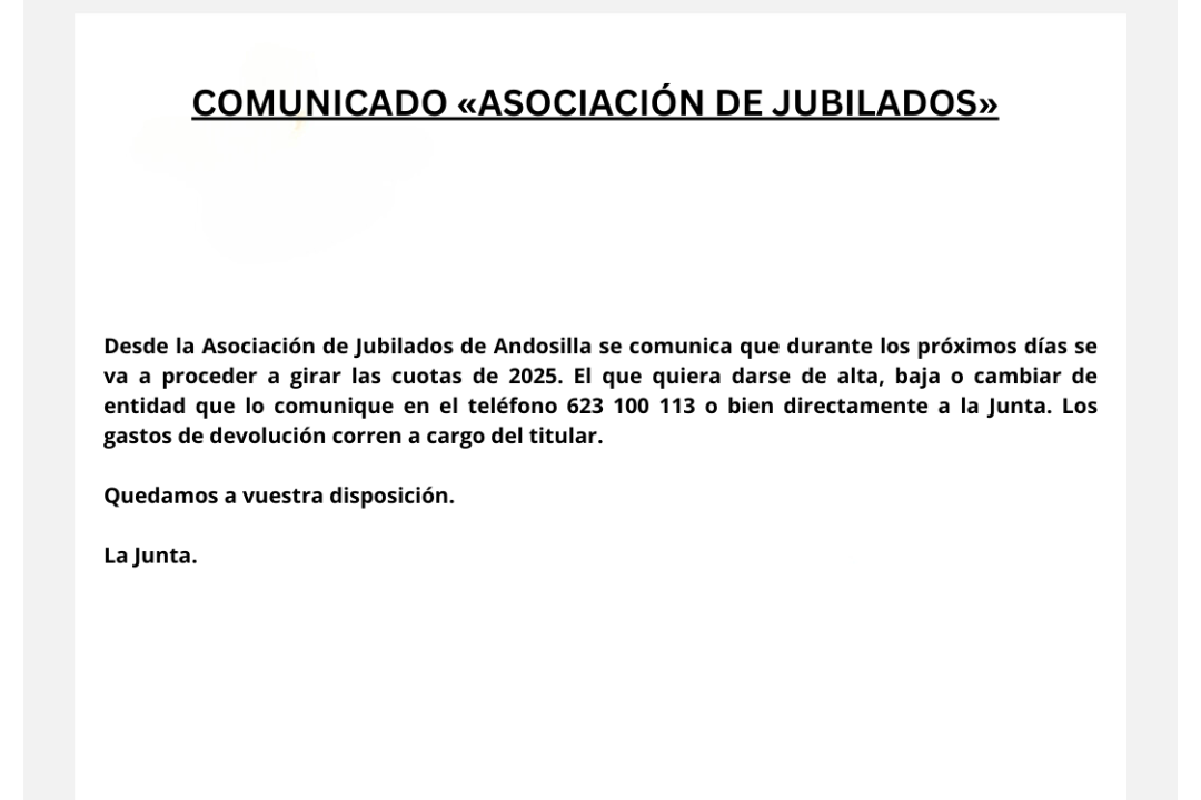 Feb112025Comunicados Categoría: ComunicadosPor Carlos Resafebrero 11, 2025Navegación entre publicacionesAnteriorPublicación anterior:Reunión «Gigantes y Cabezudos»SiguientePublicación siguiente:El River Ega te necesitaNoticias relacionadasComunicado del Ayuntamientodiciembre 22, 2025Comunicado del Ayuntamientodiciembre 21, 2025Comunicado de la Guardia Civildiciembre 2, 2025Comunicadodiciembre 1, 2025Confinamiento de explotaciones para la prevención y control del contagio por influencia aviarnoviembre 15, 2025Comunicado del polideportivo municipaloctubre 27, 2025