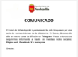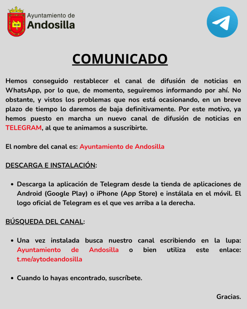 Dic222025Comunicados Enlace directo al canal de Telegram: t.me/aytodeandosilla Categoría: ComunicadosPor Carlos Resadiciembre 22, 2025Navegación entre publicacionesAnteriorPublicación anterior:Nota informativaSiguientePublicación siguiente:Concentración: En recuerdo a las mujeres asesinadas por violencia machistaNoticias relacionadasComunicado del Ayuntamientodiciembre 21, 2025Comunicado de la Guardia Civildiciembre 2, 2025Comunicadodiciembre 1, 2025Confinamiento de explotaciones para la prevención y control del contagio por influencia aviarnoviembre 15, 2025Comunicado del polideportivo municipaloctubre 27, 2025Comunicado del Ayuntamiento: Microcortes eléctricosoctubre 8, 2025