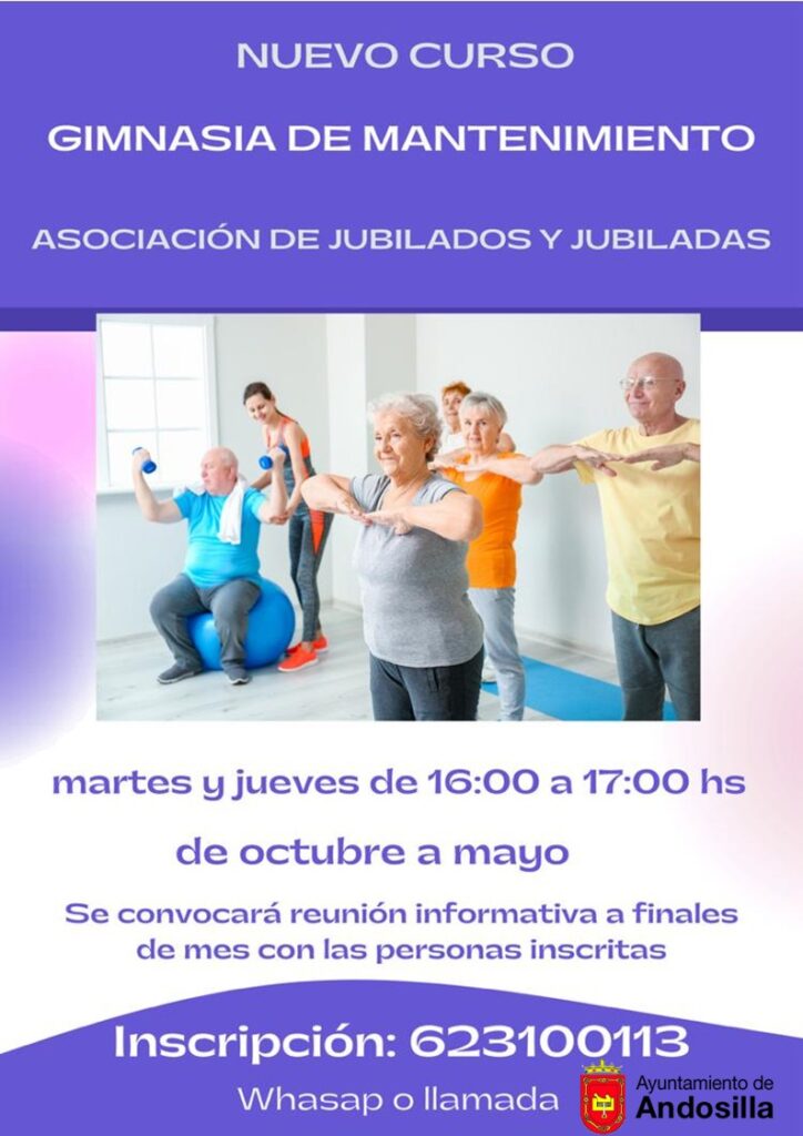 El próximo mes de octubre comenzará el curso de gimnasia de mantenimiento organizado por la Asociación de Jubilados. El plazo de inscripción finalizará el 26 de septiembre.