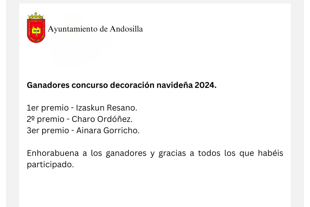 Ene32025ComunicadosCategoría: ComunicadosPor Carlos Resaenero 3, 2025Navegación entre publicacionesAnteriorPublicación anterior:Feliz Año 2025SiguientePublicación siguiente:Cabalgata Reyes 2024Noticias relacionadasComunicado del Ayuntamientodiciembre 22, 2025Comunicado del Ayuntamientodiciembre 21, 2025Comunicado de la Guardia Civildiciembre 2, 2025Comunicadodiciembre 1, 2025Confinamiento de explotaciones para la prevención y control del contagio por influencia aviarnoviembre 15, 2025Comunicado del polideportivo municipaloctubre 27, 2025