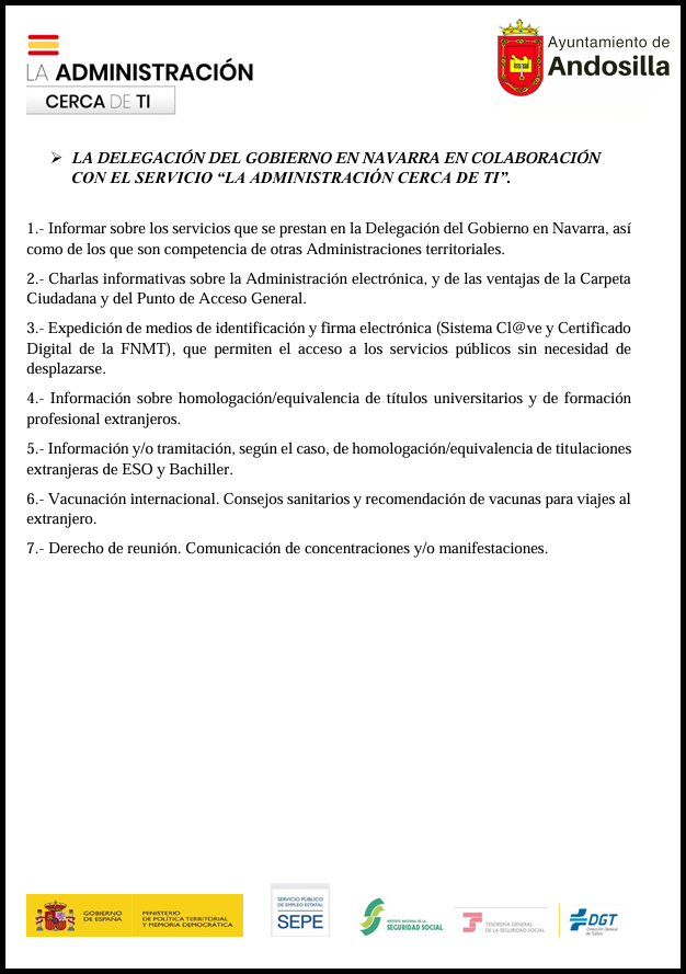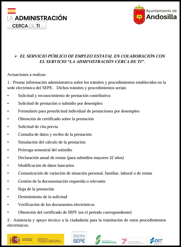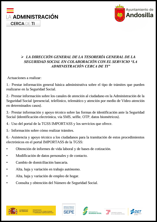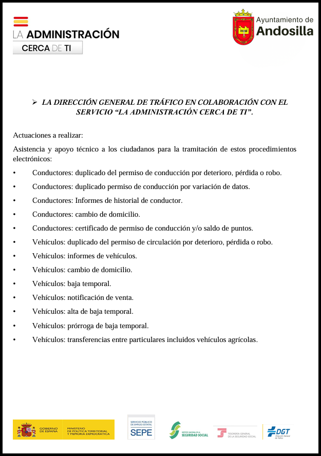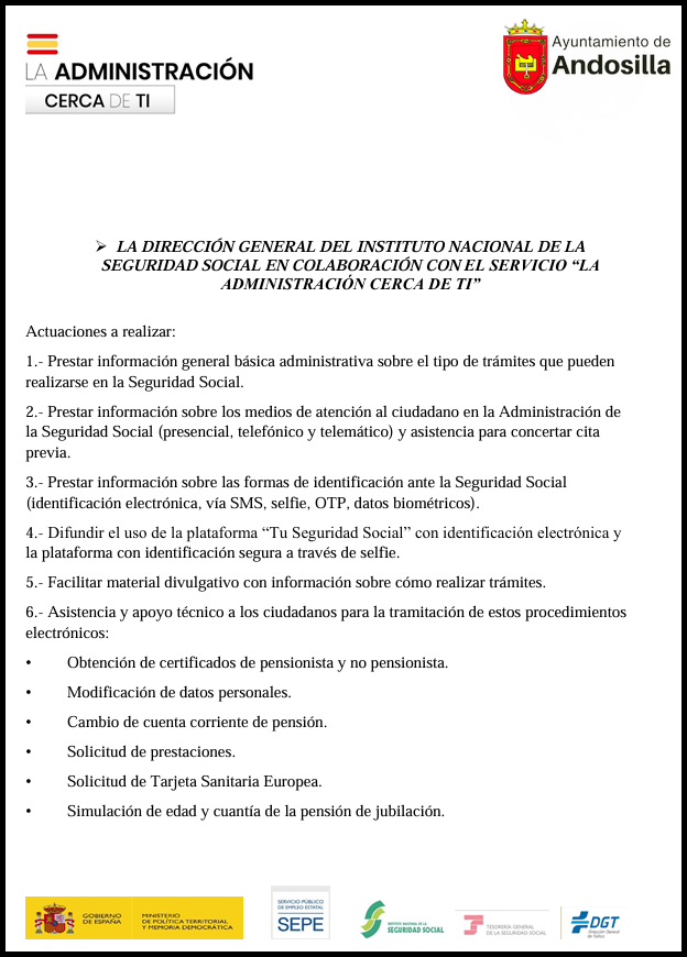 El programa «La Administración cerca de ti» acerca estos servicios al municipio con personal especializado que te atenderá de forma directa. Podrás informarte y realizar trámites relacionados con la Seguridad Social, el SEPE o la Dirección General de Tráfico, entre otros: desde obtener certificados, consultar prestaciones o vida laboral, hasta gestiones de vehículos, permisos de conducir o ayudas por desempleo.